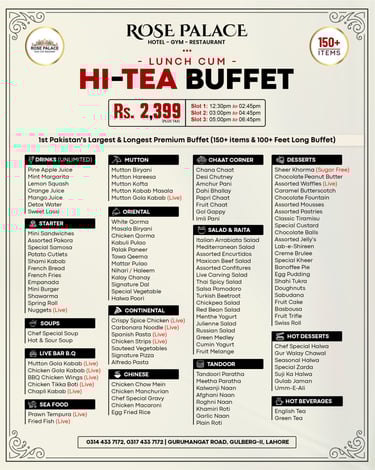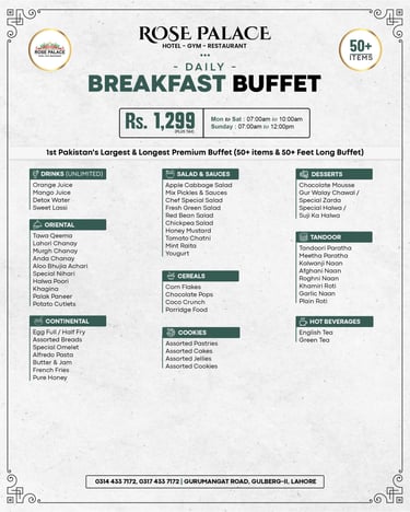 Are you looking for the best buffet restaurants in Lahore? Look no further than Rose Palace Hotel Gulberg. Our hotel offers a wide range of buffet options for breakfast, hi-tea cum lunch, and dinner.