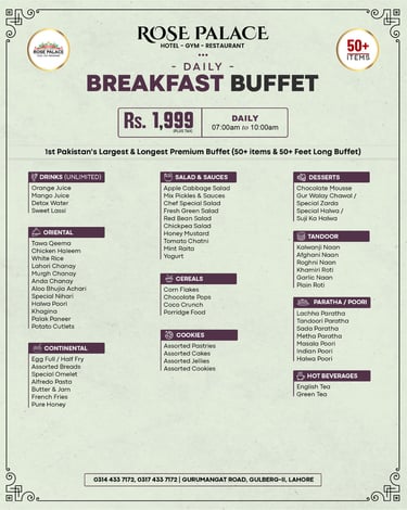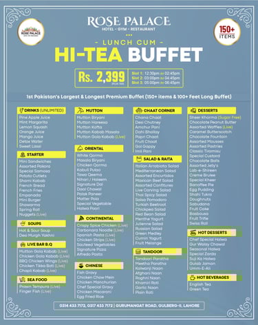 Are you looking for the best buffet restaurants in Lahore? Look no further than Rose Palace Hotel Gulberg. Our hotel offers a wide range of buffet options for breakfast, hi-tea cum lunch, and dinner.