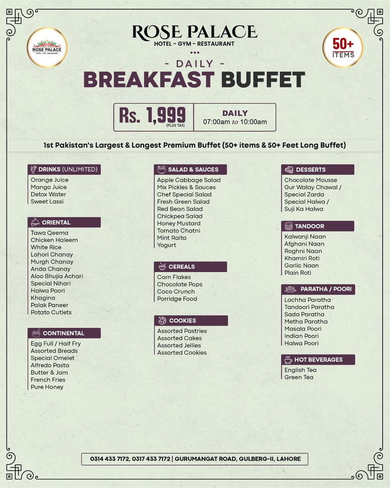 Rose Palace restaurant is located in Gulberg, Lahore, and serves an excellent breakfast buffet and delicious cuisine. This all-day dining restaurant also offers a lunch buffet and catering services for events. Come and enjoy an affordable breakfast buffet every day. We serve our patrons a delicious selection of breakfast items, such as