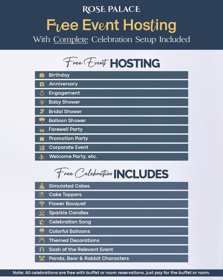 At Rose Palace, we turn your special moments into unforgettable memories. Enjoy FREE event hosting with complete celebration setup when you book a buffet or room.